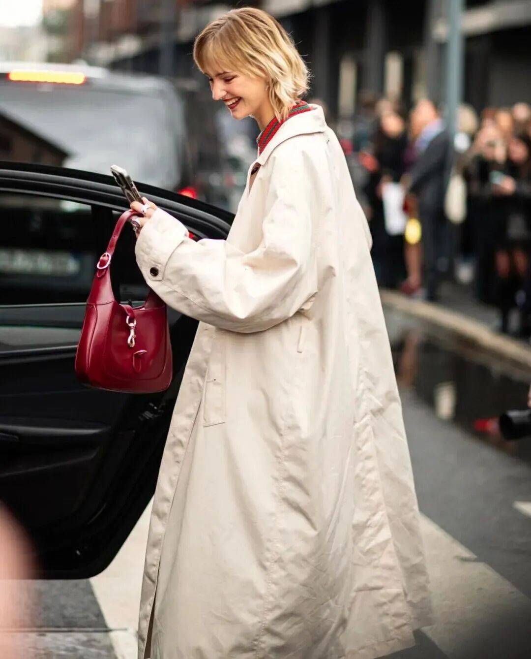 复古红大衣更是气场十足。